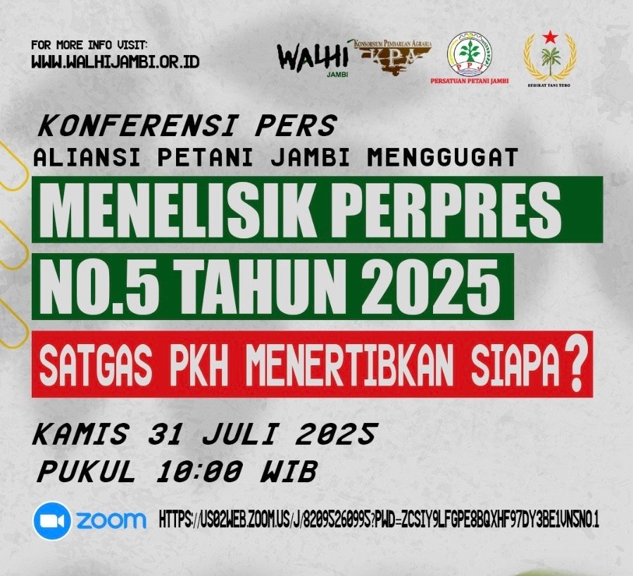 Jambi, 31 Juli 2025 – Aliansi Petani Jambi Menggugat menggelar konferensi pers di Kantor WALHI Jambi sebagai respon atas kebijakan pemerintah terkait Penertiban Kawasan Hutan (PKH) melalui Perpres No. 5 Tahun 2025. Aliansi ini merupakan gabungan petani dari berbagai wilayah di Provinsi Jambi, termasuk yang berada di dalam dan sekitar kawasan hutan.