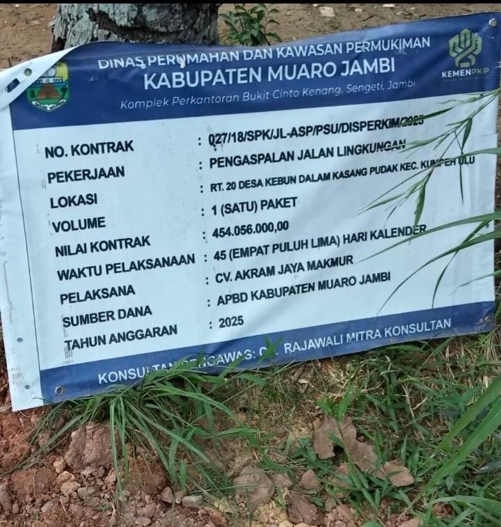 Muaro Jambi, 13 November 2025 – elangnusantara.com – Pengaspalan Jalan Lingkungan yang berlokasi di RT 20 Desa Kebun Dalam Kasang Pudak Kecamatan Kumpeh Ulu Kabupaten Muaro Jambi dengan nilai Kontrak Rp 454.056.000 sumber dana APBD Kabupaten Muaro Jambi dengan Pelaksana CV. Akram Jaya Makmur dan CV Rajawali Mitra Konsultan.