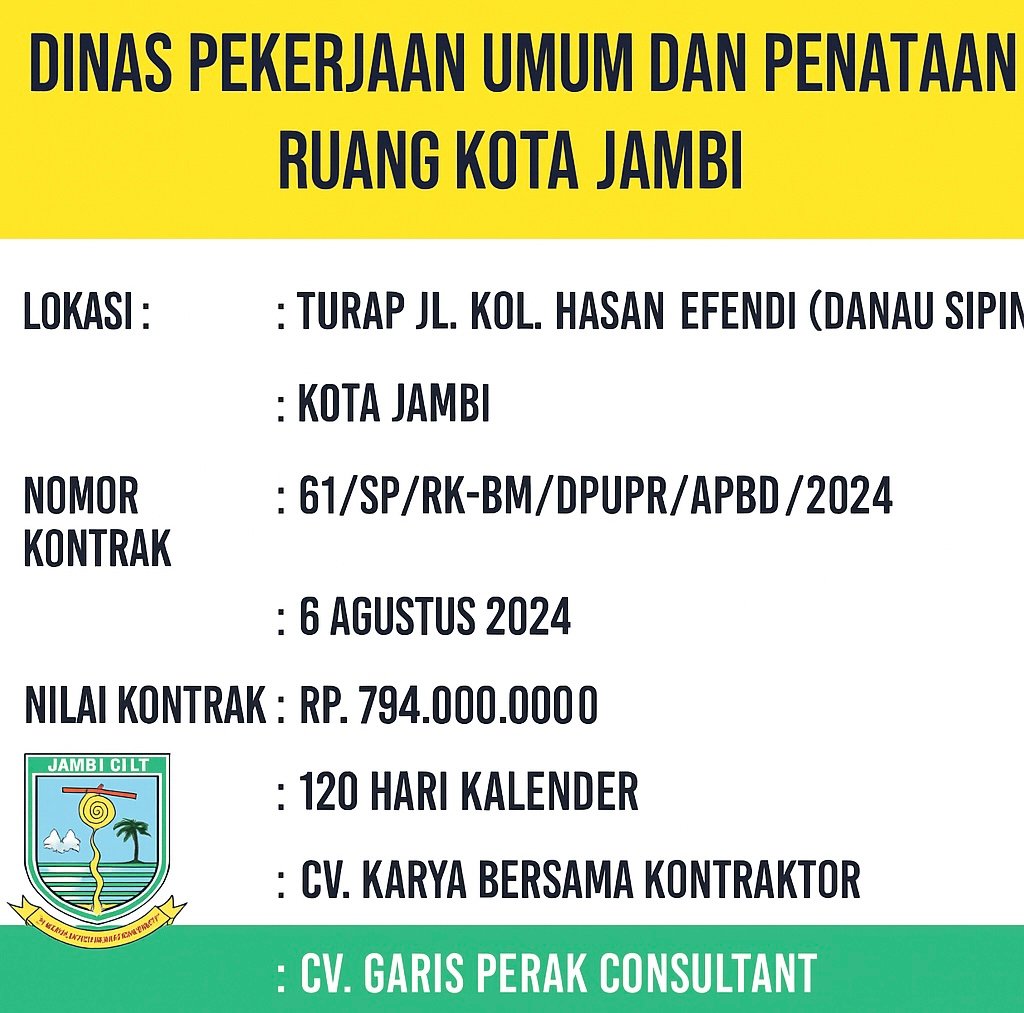Pekerjaan ini dilakukan oleh kontraktor pelaksana CV. Karya Bersama Kontraktor berdasarkan nomor kontrak 61/SP/RK-BM/DPUPR/APBD/2024, dengan pengawasan oleh CV. Garis Perak Consultant.