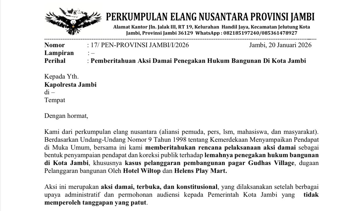 Jambi, 20 Januari 2026 – elangnusantara.com –  Lembaga Perkumpulan Elang Nusantara Provinsi Jambisecara resmi menyampaikan pemberitahuan aksi damai kepada Kepolisian Resor Kota (Polresta) Jambi terkait lemahnya penegakan hukum bangunan di Kota Jambi. Aksi tersebut dijadwalkan berlangsung selama delapan hari, mulai Kamis, 22 Januari hingga Kamis, 29 Januari 2026, dengan titik aksi di Kantor Wali Kota Jambi.