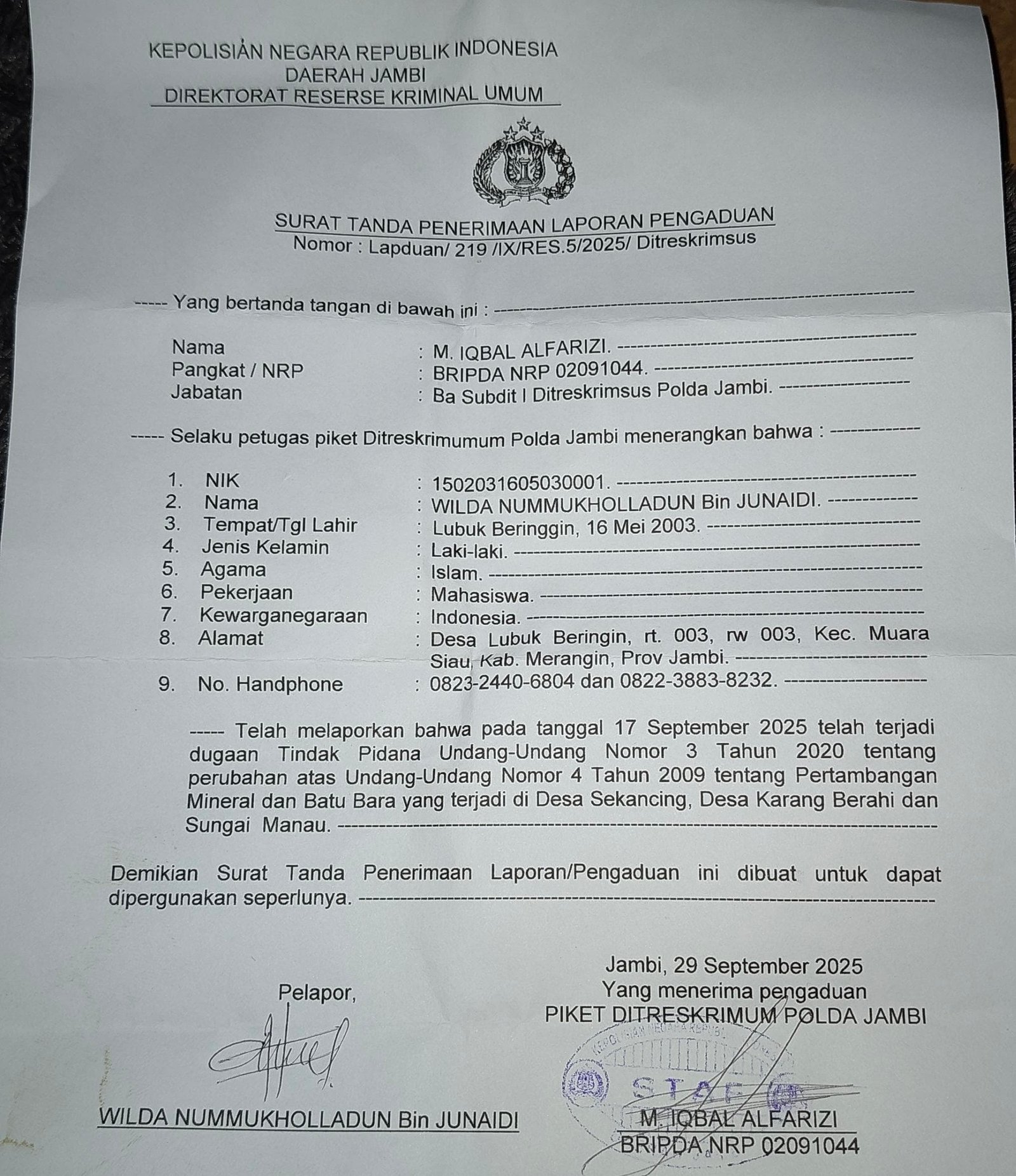 Tak hanya melalui aksi massa, langkah hukum juga ditempuh. Direktorat Reserse Kriminal Umum (Ditreskrimum) Polda Jambi tercatat menerima laporan pengaduan resmi terkait dugaan tindak pidana PETI di Kabupaten Merangin. Laporan tersebut disampaikan oleh Wilda Nummukholladun Bin Junaidi (22), seorang mahasiswa asal Desa Lubuk Beringin, Kecamatan Muara Siau, Kabupaten Merangin.